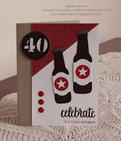 So here is my card for the 40 year old. I pulled out the Bottles & Bubbles framelits and the Bubble Over stamp set for the card. Celebrate comes from the Amazing You stamp set and the second part of the sentiment comes from the Alt & New stamp collection. The strip of designer paper comes from Simple Stories Let's Party. The numbers come from the Sizzex Tim Holtz collection.